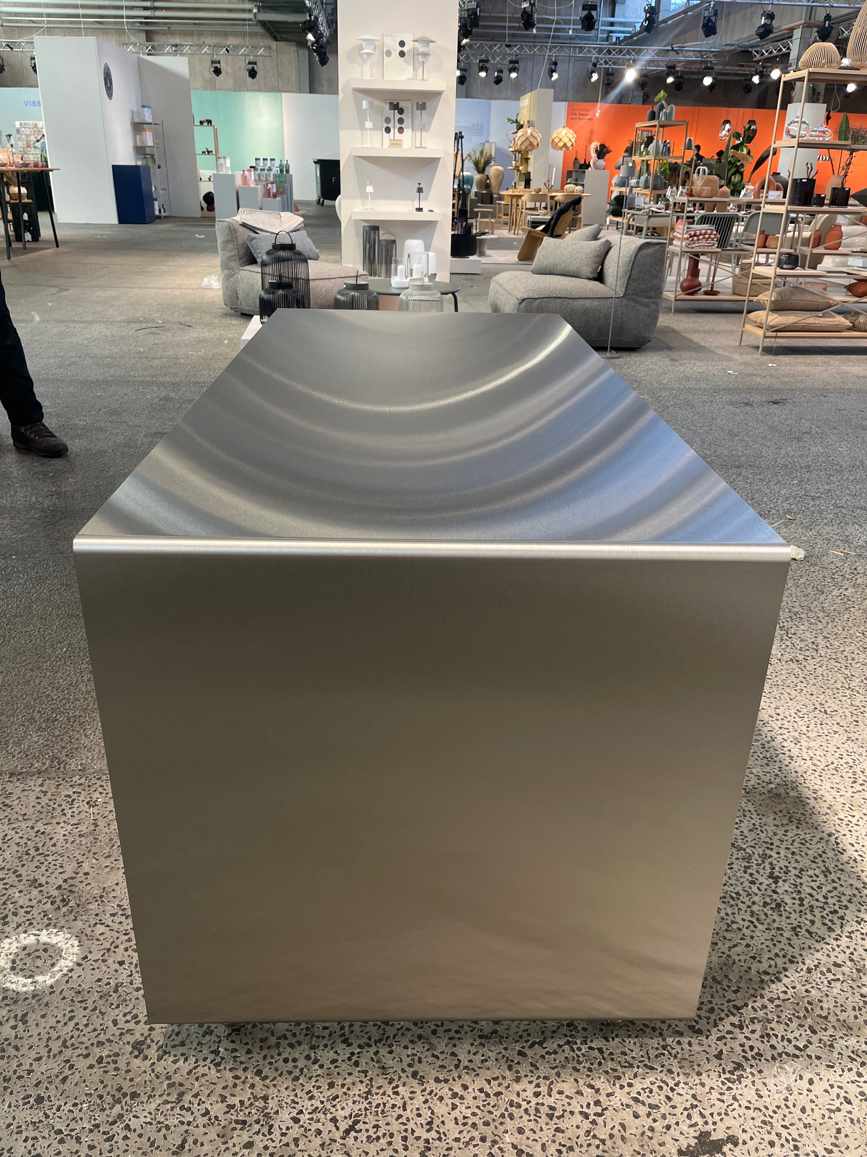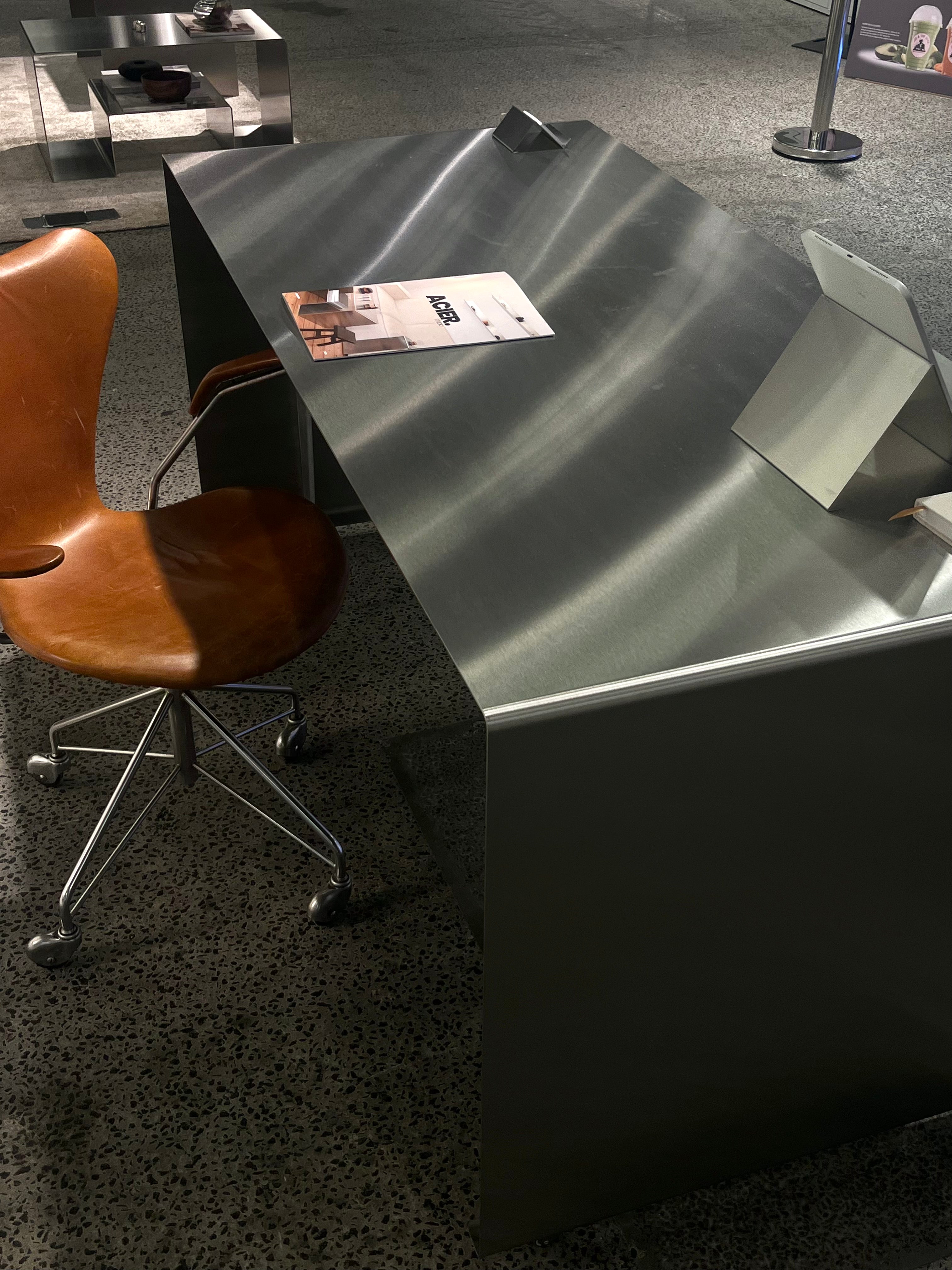 Det tidløse udtryk gør skrivebordet velegnet til alt fra hjemmekontorer til kreative studier og receptioner. Den børstede overflade giver et subtilt spil i stålets struktur, mens de præcise linjer og proportioner fremhæver materialets æstetik og robusthed. AARHUS skrivebordet er designet til at være både et arbejdsredskab og et statement-piece. Et møbel, der forener funktion og skulpturel ro.